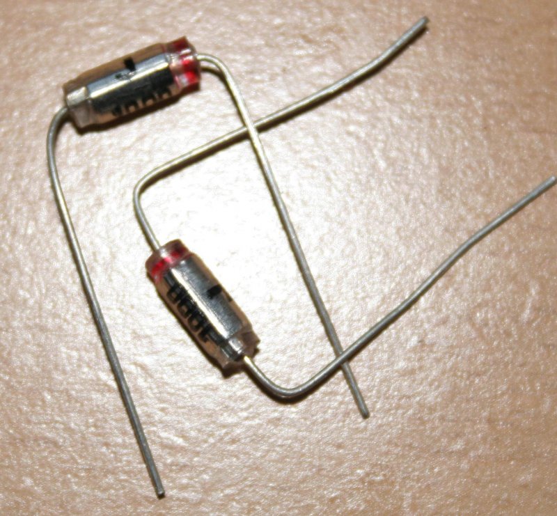 Nem hiszem, hogy pontos értékű ellenállás kell oda. Csak annyi a dolga, hogy polarizálja a diódákat. 4,7 kilósak is jók lesznek, de akár 10 kilóval is működnie kell. Diódának a "mezei" 4148-as jó, de ha van kisebb nyitófeszültségű, schottky (pl.BAT46) a fiókban még jobb.