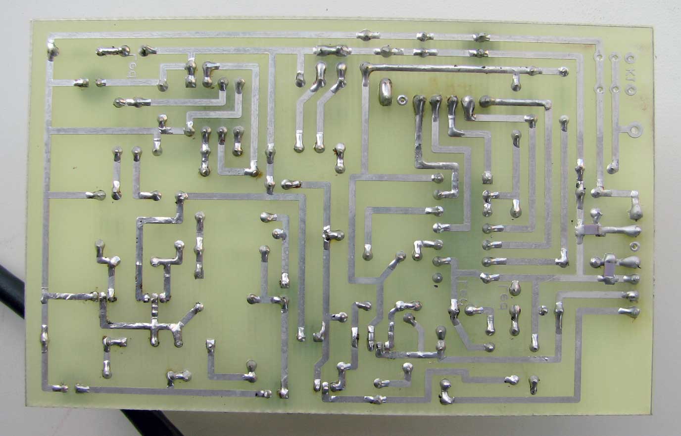 Hááát, forrasztani talán valóban tudok (a közelmúltban egy munka kapcsán elkezdtem összeszámolni, mennyit is kellett forrasztanom, aztán 2000 fölött abbahagytam ), de az elektronikában általában véve nincs nagy gyakorlatom. Ez abból is látszik, hogy - bár előre tudtam, ilyen csatikat fogok használni - nem jutott eszembe, hogy kicsi lesz nekik a lyuk. Sebaj, felfúrtam 1-es fúróval (ez volt itthon a legkisebb), aztán az ón majd "ápol és eltakar". Néhol lehet látni, hogy a rézfólia-gyűrű egy-egy sorjája kiáll az ónból. Azért a helyzethez képest sikerült jól megoldani a problémát. Legközelebb már erre is oda fogok figyelni.