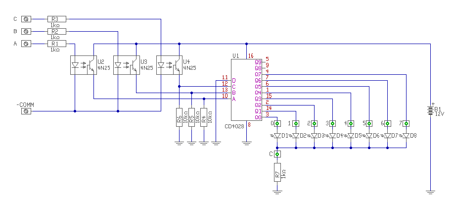 Az elmúlt napokban a következő kapcsolással küzdöttem. A cél annyi, hogy a három bemeneten (ABC) érkező jelből 4 kimenetet tudjak csinálni.