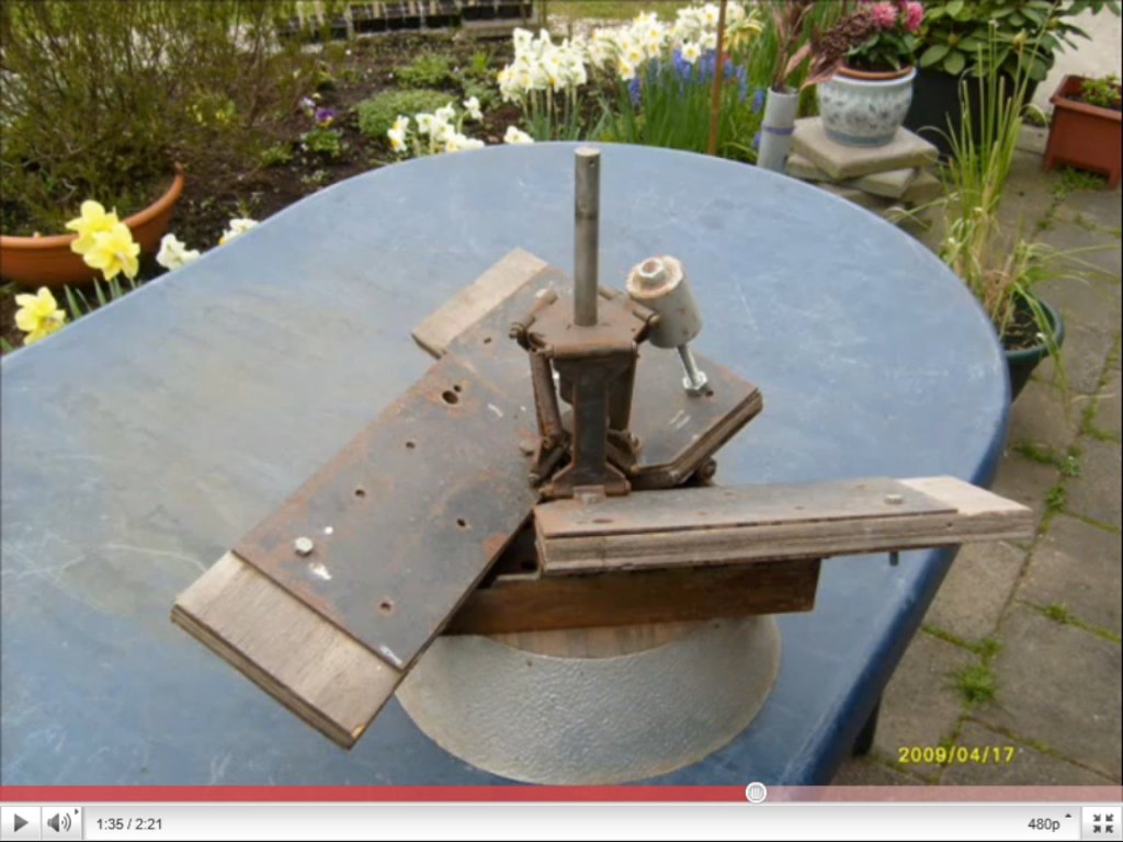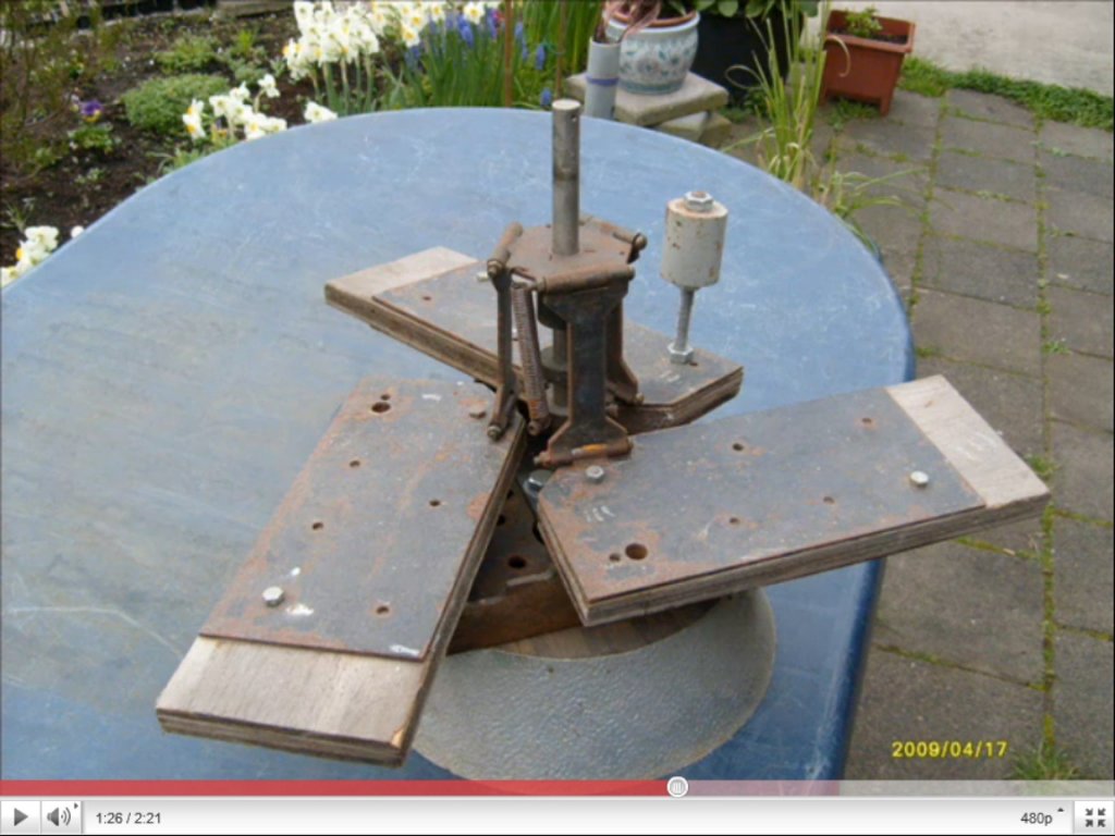 Onnantól fogva nincs nagyobb fordulat mert ugye fellép a önfékező hatás. Az egyik lapát a másik közvetlen turbolenciájában fut és nem bír több levegőbe kapaszkodni mint amannyit az előtte lévő lapát hagy neki és így tovább. Ha jól beállítanánk a súlyt ill. a rugót és a lapátok merevítése is megvan akkor nem okozna fejtörést hogy kis szélben is termeljen de erős szélben se féljünk a túlpörgéstől. A beállítást el lehetne végezni állítható fordulatszámú motorral, az esztergapad erre pont jó. De akinek nincs az talán a traktorok hátsó tengely vége + gardán+ derékszöghajtás és máris kész a függőleges tengelyű lapátteszter. A fordulatszám megállapításához már kellene egy mérő de azt nem nehéz csinálni. Csak legyen olyan hosszú a gardán mint a lapátok megy egy kicsi.