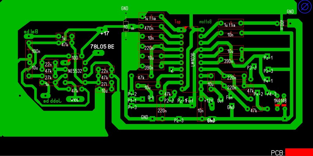 De minden alkatrész méretet meg tudsz mérni pontosan a sprintlayout-ban ![]() Szabályzó potik lineárisak. Javaslom, hogy az NE5532 táp lába közelébe tegyél egy 10-100 nF kerámia kondit ez még az én tervemről hiányzik. R2-R7 az nálam egy 47k sztereó poti. Így 0-2,5x között tudom állítani az előerősítést. Értékek ez alapján: http://www.hobbielektronika.hu/forum/files/55/5577a52635d5fe8d98d15...57.jpg Figyelj rá, hogy a két dióda sincs még a tervemen a hangerőszalyzón. Az én a vezetékbe építettem. Mindját adok képet is.