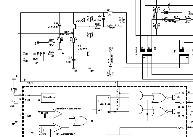 Egy AT-s tápot szeretnék átalakítani. Nekem csak az 5V és a 12V kell, de az utóbbiból kell negatív is ugyan akkora teljesítményen mint a pozitív ágban. Nem is ez a gondom, mert ez egyszerű feladat. A gondom a rövidzár és túláram védelemmel lenne, ami a DTC-t vezérli. Ha a Q3 bázisáról lekötöm az R27, R26, R25 és D11-es alkatrészeket (lásd mellékelt kép), akkor ugye a túláram védelem még működni fog? A védelmi áramkör a referencia feszültséget kapja meg, csak lemaradt a képről...