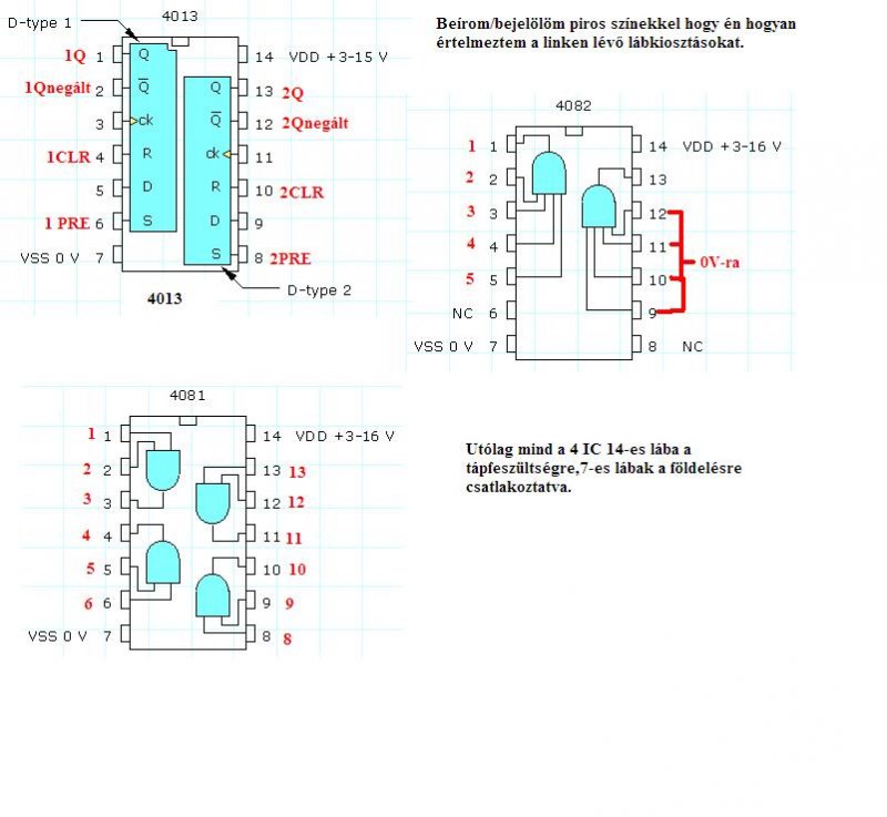 Ez Bővebben: Link alapján mondom a bekötéseket. -8-as és 6-os lábak a földelésre. -5-ös és 9-es lábak a tápfeszültségre -1-es és 13-as lábak a LEDekre(ellenállásokon keresztül) -2-es és 12-es lábak a 4082-es IC bemenetére Ezenkívül mind a 4 IC 7-es lábaik a földelésre,14-es lábaik a tápfeszültségre. -3-as és 11-es lábakat összekötve.Kipróbáltam úgy is hogy ezt a kettőst kötöttem a tápra,a másikat a földre. -4-es és 10-es lábak összekötve.Kipróbáltam úgy is hogy ezt a kettőst kötöttem a tápra,a másikat a földre. Eredmény:2 LED világít,a másik kettő nem.A kapcsolókra pedig nagy ívben xarik a kapcsolás,hiába nyomogatom őket,semmi változás. Mind1.Azért köszönöm a segítségeket.Elkönyvelem úgy hogy én rontottam el valamit valahol,de hogy mit...?! további kellemes napot