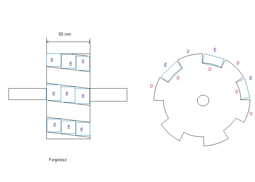 A te rajzodon ha jól veszem ki, 6 mágnessel van kialakítva 12 pólus, a vas forgórész segítségével, én úgy gondoltam, hogy az egymás utáni mágneseket fordított polaritással rakom fel.