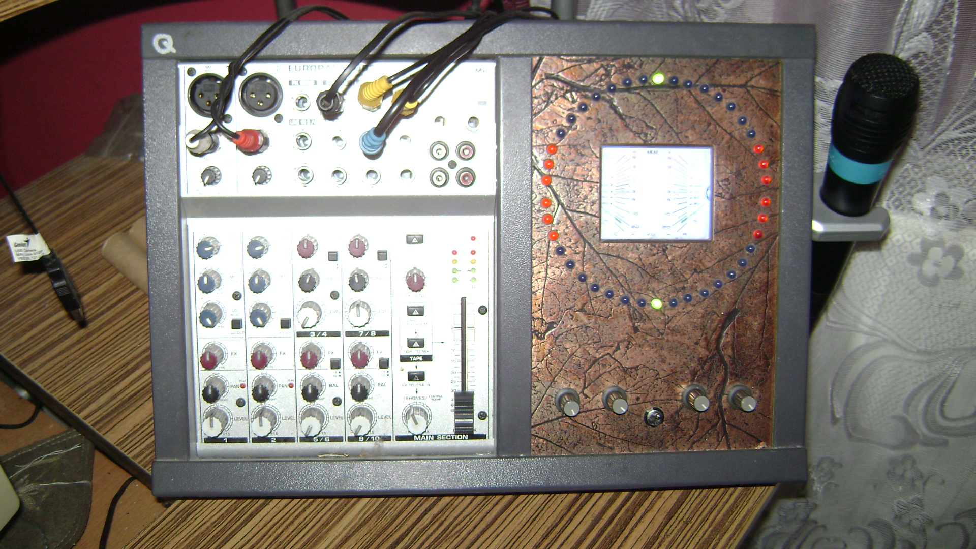 Csinálok majd képeket. Nekem nagyon bejön. Van fölötte egy 2X12-es Led kijelző+egy 36Cm széles Deprezes kijelző kék világítással ami által narancsba világítanak a mutatók. Majd csinálok képeket. Ezenkívűl a keverőmbe ami szintén 50%-ba saját készítés 2db Akai Deprez a bejövő+2X körkörösen Led kiv. a kimenő jelre. Erről van képem.