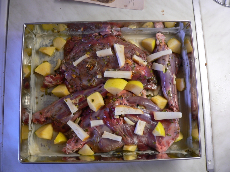 Beindul a Nagy Projekt! Minek folytán Bambi a múltkor belenézett egy 30-06-os Mauser csövébe és eképpen itthagyta ezt az elvetélt árnyékvilágot, ma sült őzcomb lesz a kaja. Egész éjjel ázott a vadpácban, most reggel lecsorgattam, megspékeltem nyegyed kiló füstölt szalonnával, meg egy fej fokhagymával. Rászórtunk almadarabokat, a maradék fokhagymát, szalonnát. Megkapja még a sót, mega borsot, aztán lefóliázva megy a sütőbe. 80 fokon indul a sütés, aztán óránként emelek 25 fokot. Sajnos, ez ugye többórás lassú sütést jelent, nem is tudom, hogy fogom kibírni. Alább látható Bambi az új környezetében. Ha érdekel Benneteket, délután beszámolok a fejleményekről.