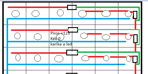 Egyébként 52 Zöld Ledből állna az egész kb.15V kell hozzá! Olyanra gondoltam még hogy az utólsó ledek a csík alján pirosak lennének és ahhoz megkora ellenálás szükséges ? Eszt még majd átgondolom . De csináltam egy kapcsolási rajzot ! Köszönök előre is válaszokat!