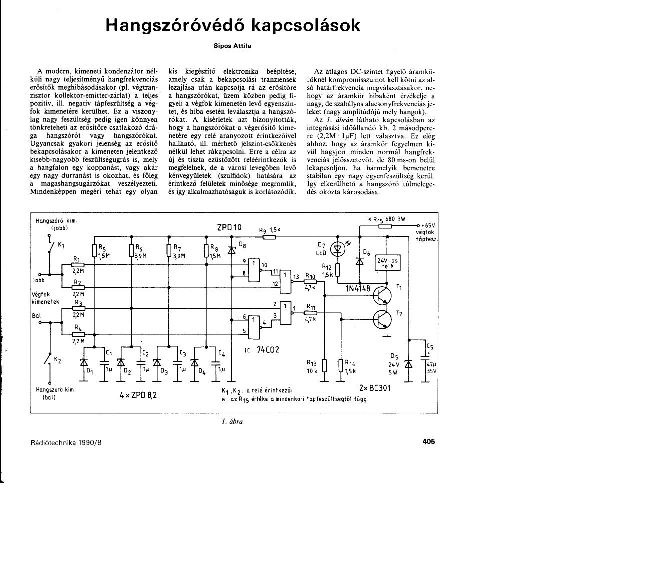 Az urbános koppanásgátló tökéletesen megfelel. Sztereo végfokhoz értelemszerűen kettő kell. Valamelyik '90-es Rádiótechnikában benn van kapcsrajz nyák meg minden. A 200W-os QUAD is kettő ilyet kapott. Mondjuk azt érdemes tudni, hogy ez a cucc csak a hangszórókat védi meg a DC-től, ha valami okból kifolyólag bekrepál a végfok, illetve a bekapcsolási és kikapcsolási tranziensektől is véd (késleltetve kapcsolja a relé a végfok kimenetét a hangfalra, az erősítő kikapcsolásakor pedig azonnal elenged a relé, illetve ha a kimenetre DC kerül akkor is kikapcsol a relé)