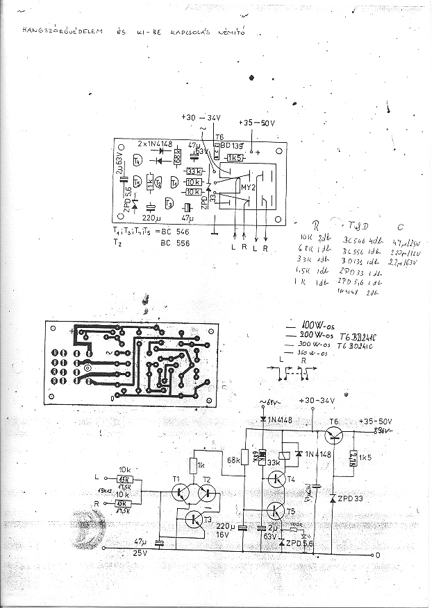 Adok egy régi de tuti működő koppanásgátló, egyenfesz figyelő áramkört. Én mindig ezt használom minden erősítőmben. /a beirt adatok a nagyobb teljesítményre vonat koznak/ a NYÁKterv eltér a kapcsolástól abban, hogy 4 érintkezős a relé. (MY4-es)
