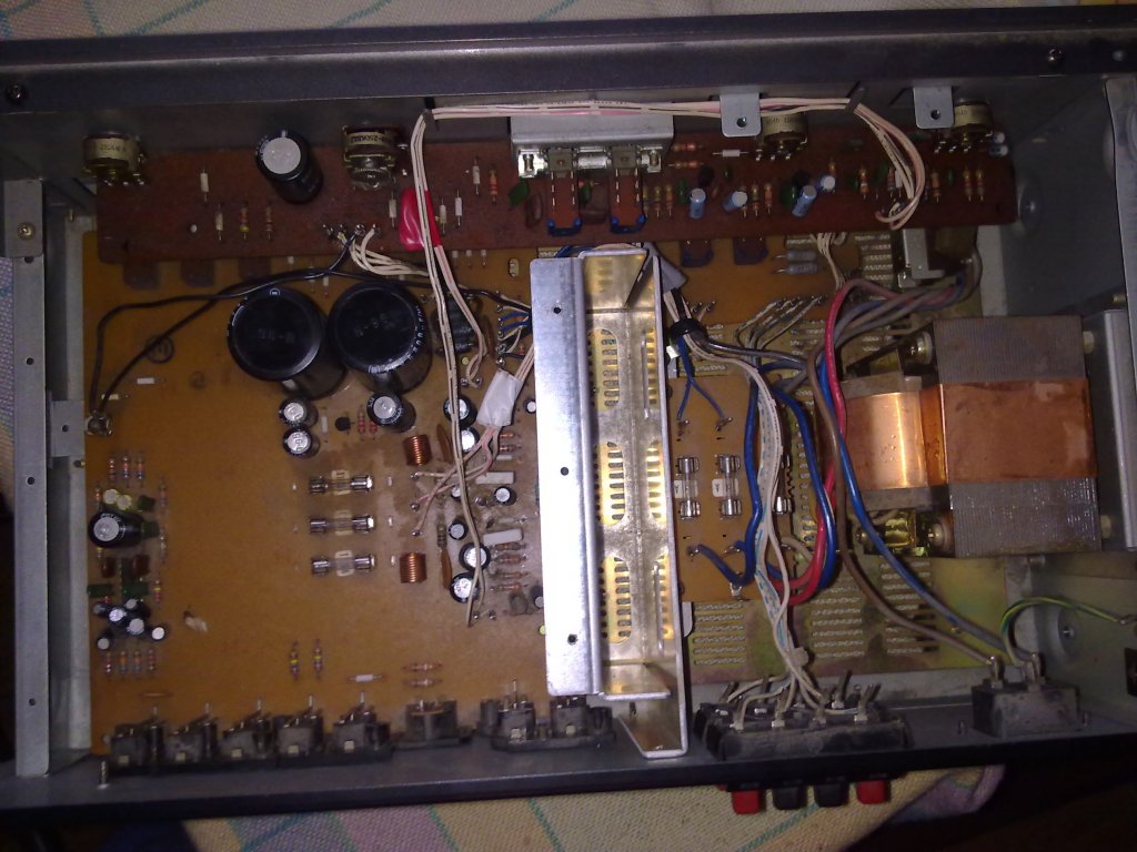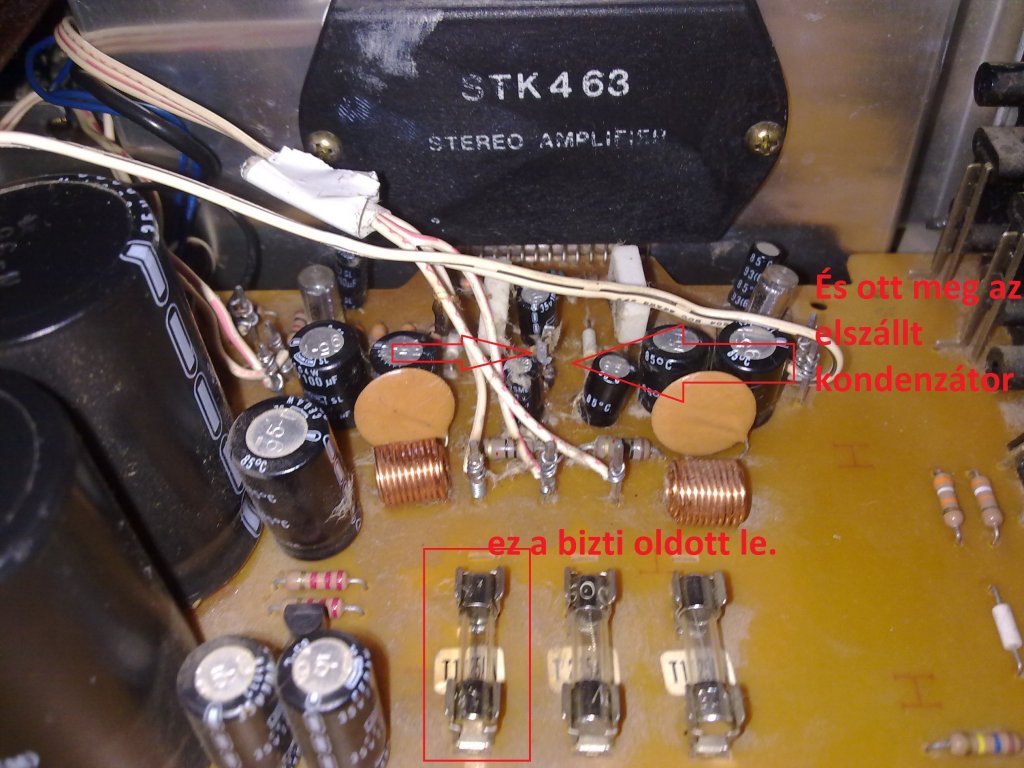 Egyik nap kaptam egy AKAI AM 2250 nevű erősítőt stk 463-as icvel. A probléma az hogy a tulaj elmondása szerint egy házibulin nagyon meghajtották meg a hangfalak? sem szakszerűen voltak rákötve. Először csak egy biztit vágott ki de a csere után már két kondenzátor is elszállt. A cserék után már csak az egyik kondenzátor szált el bár igaz hogy nem volt itthon 10µF/ 35v-os kondim hanem csak 50 voltos de azt is kivágta de a bizti viszont nem oldott le csak a kondi durrant el. Mellékelek pár képet az erősítőröl meg egy kapcsolási rajzot hátha tudtok segíteni mi lehet a rejtelmes hiba vagy merre induljak el a hiba keresésében.