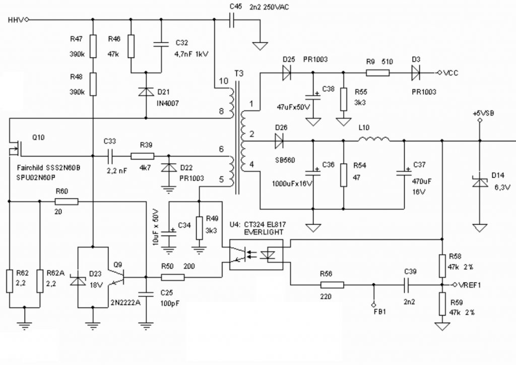 első körben inkább a kondikat kellene ellenőrizni, főleg a kimeneten, és a primer köri segédtáp 10u. Nem látom a bejövő villanyon a pufferkondit..