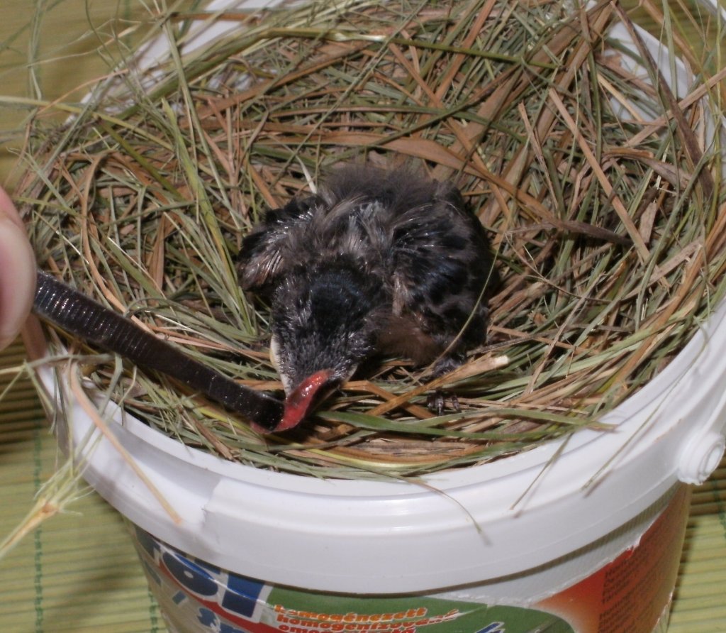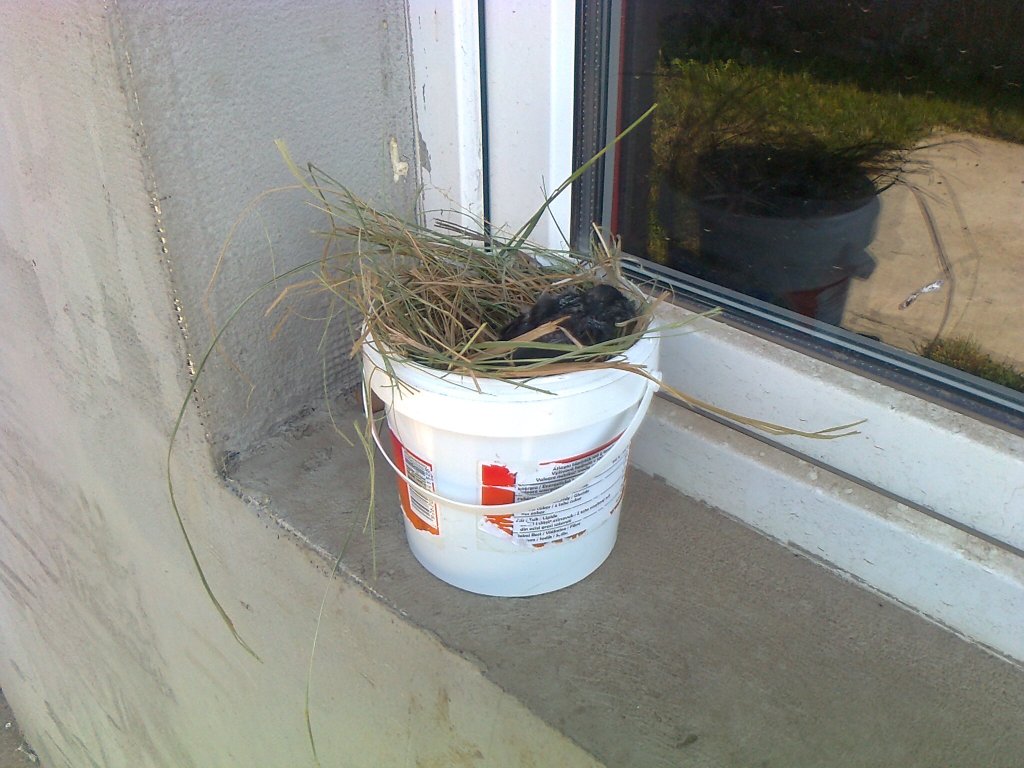 Eddig tartott a fióka nevelése. Vissza mentem oda ahol találtam. És nem messze onnan meg is találtam a fészküket. Vissza is vittem. Így csak kirándulni és lakomázni volt nálunk. 0094-es képen a testvére üldögél a betonon. Addigra ő is katapultált a fészekből. Igaz ő csak függőlegesen haladt 3 métert.