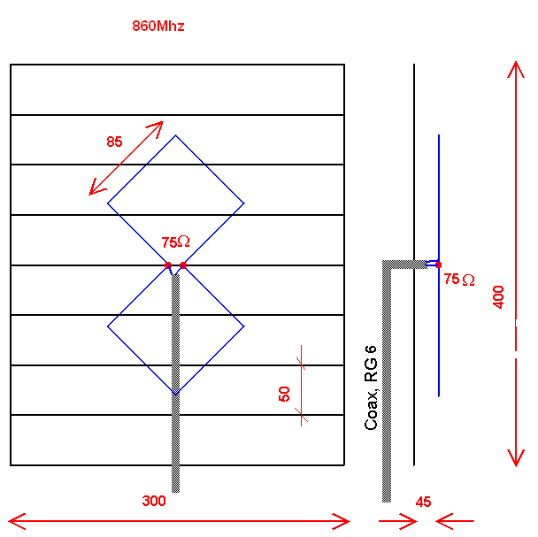 A dipólok összekötését végig párhuzamosan futó vezetékkel 40 mm térközzel kell megoldani. A keresztezés közvetlenül a szélső dipólok alatt történik. Fontos még a kábelbekötés, a szimmetrizáló kivitele. Legjobb a levezető kábel anyagából készült balun hurok. 140mm hosszú. A szélső és a középső dipólok közti távolság max. 160mm lehet. A lepkénél jobb felső sávi antenna a kettős quad hurok. Egyszerűbb elkészíteni, mint a lepkét rendbe hozni. Szimmetrizáló sem kell. A lepke reflektora megfelelő erre a célra.