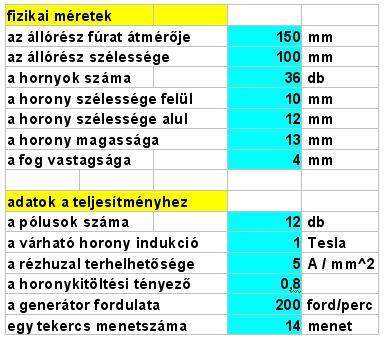 Mostanra készültem el én is hind generátorának a számításaival. 3fázisú tekercselés, csillag kötés, 12 pólus, a táblázatok szerint megengedett(nél kicsit magasabb) légrésindukcióval 1-1 fázis menetszáma 578 (12-vel oszthatóság). Egy-egy pólustekercs menetszáma így 48 menet lesz, amit ügyes tekercselő 1,12-es huzalból talán bele tud fektetni a horonyba. Ez az adott értékekkel 200 fordulatnál ~100 V fázisfeszültséget ad, ami csillagkötéssel, egyenirányítás után ~250 V üresjárati egyenfeszültséget.