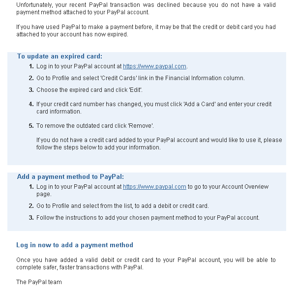 Kedden raktam a paypal számlámra 8000Ft-ot, ami tegnap rajta volt, így kifizettem a hétfőn vásárolt termékemet, mire ma kaptam egy email-t: Idézet: „Unfortunately, your recent PayPal transaction was declined because you do not have a valid payment method attached to your PayPal account. If you have used PayPal to make a payment before, it may be that the credit or debit card you had attached to your account has now expired.” Most mit tegyek? Pár nappal ezelőtt még tudtam vele fizetni! Ma mindenféleképpen le kellene bonyolítanom a fizetést! Viszont a termék árát amit kifizettem levonta a számláról! Mit tudok ost csinálni?