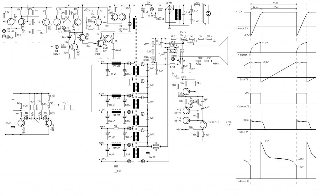 A +- 450 V hogy elég-e, az attól függ, hogy milyen a katódsugár cső. Ezt a típust nem ismerem, ha spec alacsony feszültségű, akkor lehet, de általában 1 kV -nál nagyobb feszültség szükséges. A kevés a feszültség, akkor nem lehet jól fókuszálni, és az asztigmatizmust sem lehet beállítani.