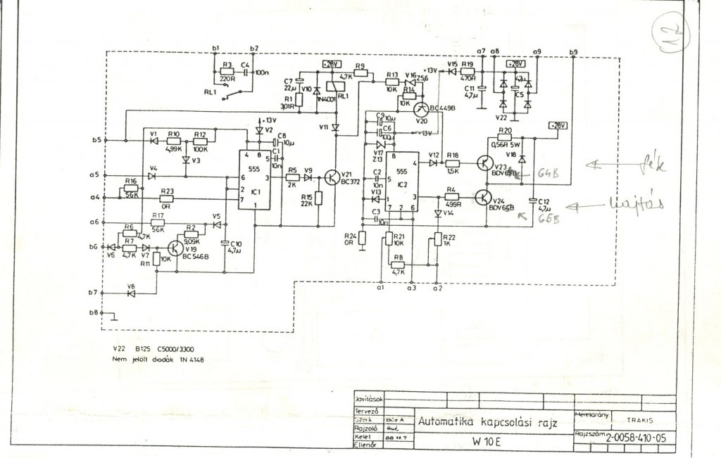 Elkezdtem visszarajzolni, és sajnos nem csak annyi az eltérés,hogy a "fékezés" hogyan van megoldva.A két 555-tel felépített áramkör között is van kapcsolat. A hibajelenség az, hogy ha megnyomom a pisztolykapcsolót, (b7-b8-at rövidre zárom, mert nincs nálam a gép, csak a panel) akkor a két teljesítménytranyó, BDV64/BDV65 azonnal megadja magát, CE zárlatba megy.A 65-ös kapcsolja magát a motort PWM-mel, és a 64-es az ami rövidre zárja a motor tekercsét egy ellenálláson keresztül. Ha a 64-est nem teszem bele akkor működik is, lehet szabályozni a fordulatot.Viszont ilyenkor egyből bekapcsolás után már van feszültség a lámpán ami a motort helyettesíti, pedig nem nyomtam meg a pisztolykapcsolót.