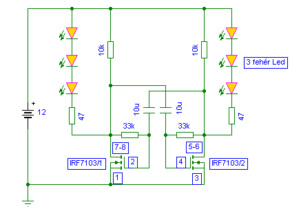 A tranzisztor, egy áramvezérelt eszköz, ahol ha növeled a kollektoráramot, a bázisáramot is növelned kell. Ezért a bázisellenállás értékét változtatni kell. Ezzel a villogás üteme is változik. Ha Fet tranyóból készíted, akkor a párhuzamos Led-sorok számát, szinte tetszőlegesen növelheted, amíg a Fet bírja. Nem kötelező ebből a típusból felépíteni, de készítheted egy IRF7103-ból is. Kb. 100Ft-ért kapsz benne két 3A-es Fet-et. (A két ág árama, jelenleg kb. 20-20mA ha a Led-ek fehérek. Ha nem., akkor előtét ellenállást újra kell számítani.) üdv! proli007 A hozzászólás módosítva: Szept 26, 2012