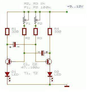 Ezt nézd meg! Én megcsináltam és tökéletesen működik! Tettem mellé egy NYÁK-rajzot is! IC1=NE555 R1=4,7 k R2,3=470 ohm C1=10 mikroF C2=10 nF P1=47 k D1,D2=LED