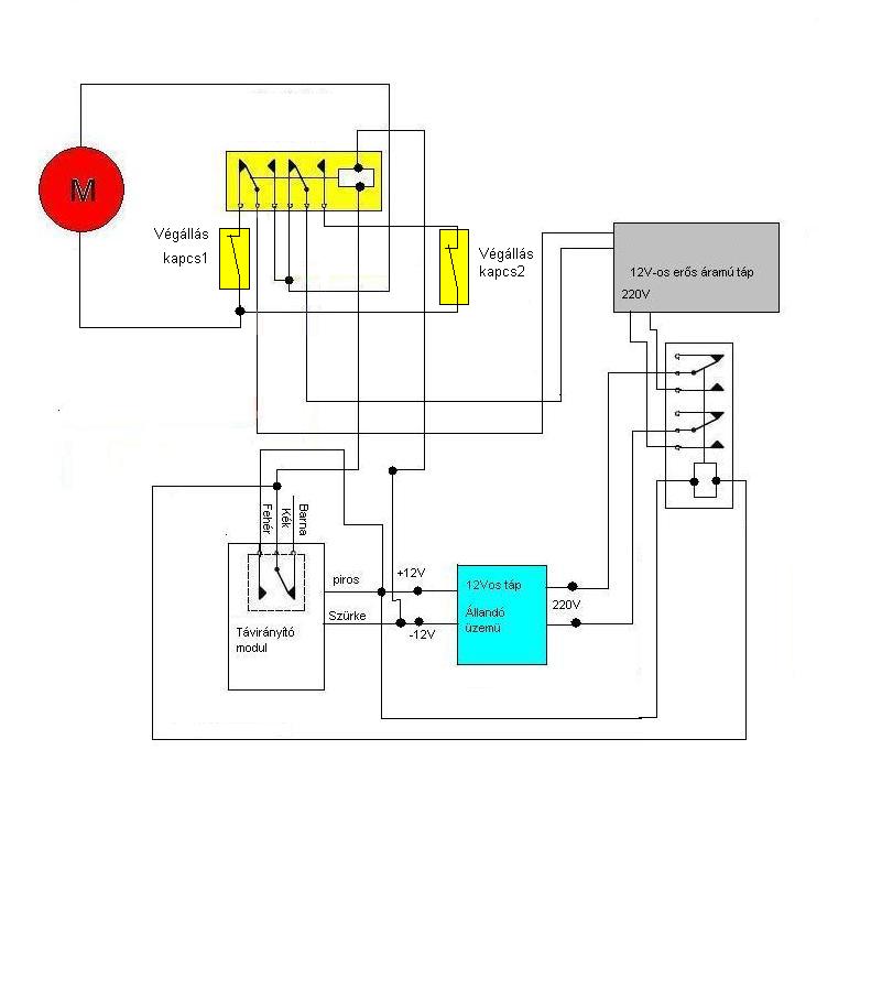 van itt egy kis gond az áramköröddel a végállás kapcsolók és a motor vezérlő relé az OK! bár én a jobb áttekinthetőség miatt a motor kimeneteket a relé közös érintkezőire kötöttem volna, de azért működik Viszont ha te most ennek az áramkörnek áramot adnál akkor az történne, hogy az R1 az R2-n keresztül áramot kapna (kb 6V) amit szerintem nem vettél észre valszeg mindkét relé behúzna 6 volt fesztől ami nem jó (piros vonallal jelöltem). ha pedig a rádióvevő reléje kapcsol az R2 működne, viszont az R1 közös potenciálra kerülne és az se jó. azon kívül felmerül egy kérdés, ezt a vevőt nem ismerem, de amiket ismerek azok addig kapcsolnak amíg nyomjuk a távirányítót, namármost szerintem kell egy időzítő áramkör is ide, vagy addig nyílik a kapu amíg nyomod a távirányítót, ami nem túl praktikus szerintem most egyenlőre ennyi, majd küldök egy módosított rajzot, ahogy én csinálnám üdv