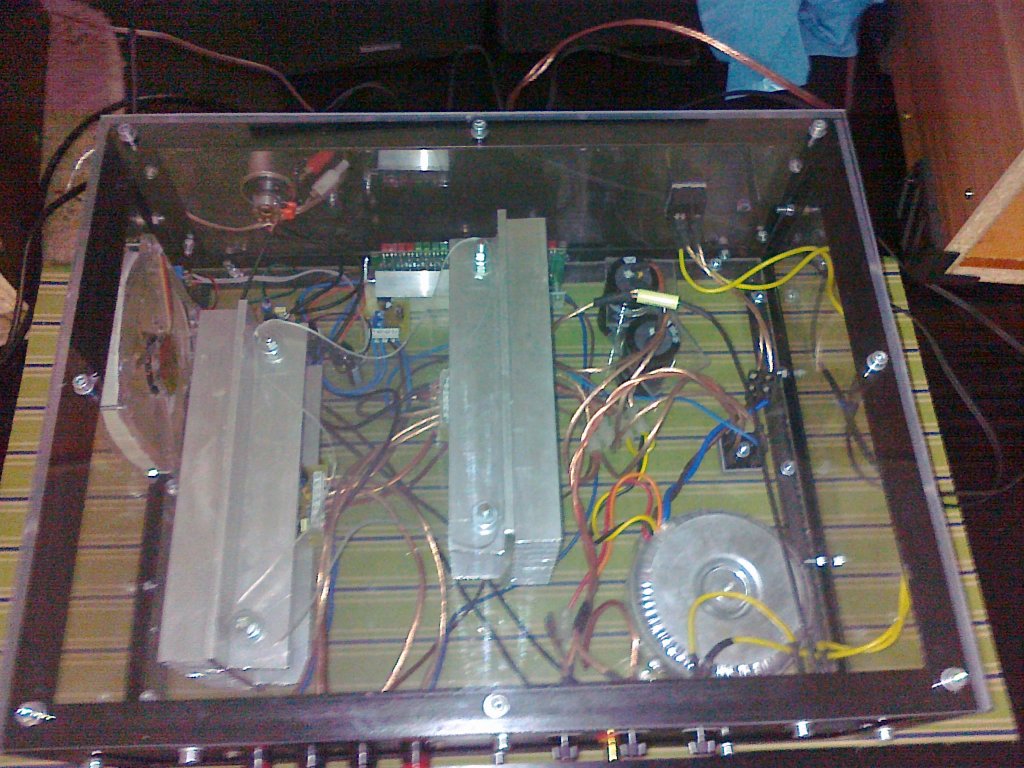 Új vagyok a fórumon, az oldalt már régóta ismerem, és persze érdeklődök valamennyire az elektronka iránt. Hobbiból készítettem is egy erősítőt, amiről most megkérdezném véleményeteket! Első munkám, tudom még van mit fejlődni! Egy 225 W toroid trafó és 2 db 10000 µF kondi szolgáltatja a +- 36 V tápfeszültséget a két TDA 7294 IC-t használó végfok számára. Nem akartam semmi extrát, hangszínt, bemenetválasztót stb, elvégre első próbálkozás. Beépítettem egy előerősítő áramkört is, ehhez egy 12V-os táp is kellet. Ez kiszolgálja továbbá a hűtőt, és a kivezérlésmérőt is. Az áramköri lapokat sajnos nem én terveztem, csak a fúrás forrasztás maradt rám. A váz 25 mm szögvas, hegesztve( ) + plexi borítás, a hátlap perforált lemez. [strapabírót szerettem volna ] Még tervezek egy hangszóróvédelmet. A hangfalak is saját készítésűek. Kérlek mondjátok el véleményeiteket!Köszönet a sok segítségért és a nyáktervekért Morris Pedronak! Remélem nem veszi zokon