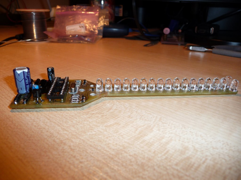 Mellékletem az én változatomat. Először normál alkatrészekkel építettük meg, majd a panel könnyebbé tétele miatt a tranzisztorokat és az ellenállásokat SMD-re cseréltük. Fontos szempont volt, hogy a LED-eket le lehessen nyomni a panel szintjére (csak 1 oldalról kelljen forrasztani) és hogy házilag könnyen kivitelezhető legyen a panel. A kapcsolási rajzon nem változtattam, csak a NYÁK-ot terveztem újra. A program a 2.27-es RTC-s verzió. A file KiCAD-dal nyitható meg (bocs, nekem ez áll kézre). Néhány jótanács a megépítéshez: A fototranzisztort a PIC-el ellentétes oldalra ("lefele") kell beforrasztani. Az infravevőt (TSOP) elfektettem, az tartja az elemet az egyik oldalról. A panelt átfúrtam az elem helyén. Az elem érintkezőjét egy tönkrement reléből mentettem meg. A shotky-diódát a puffer elkó lábaira forrasztottam, az elkót kifelel (a LED-ekkel ellentétes irányba elfektettem)
