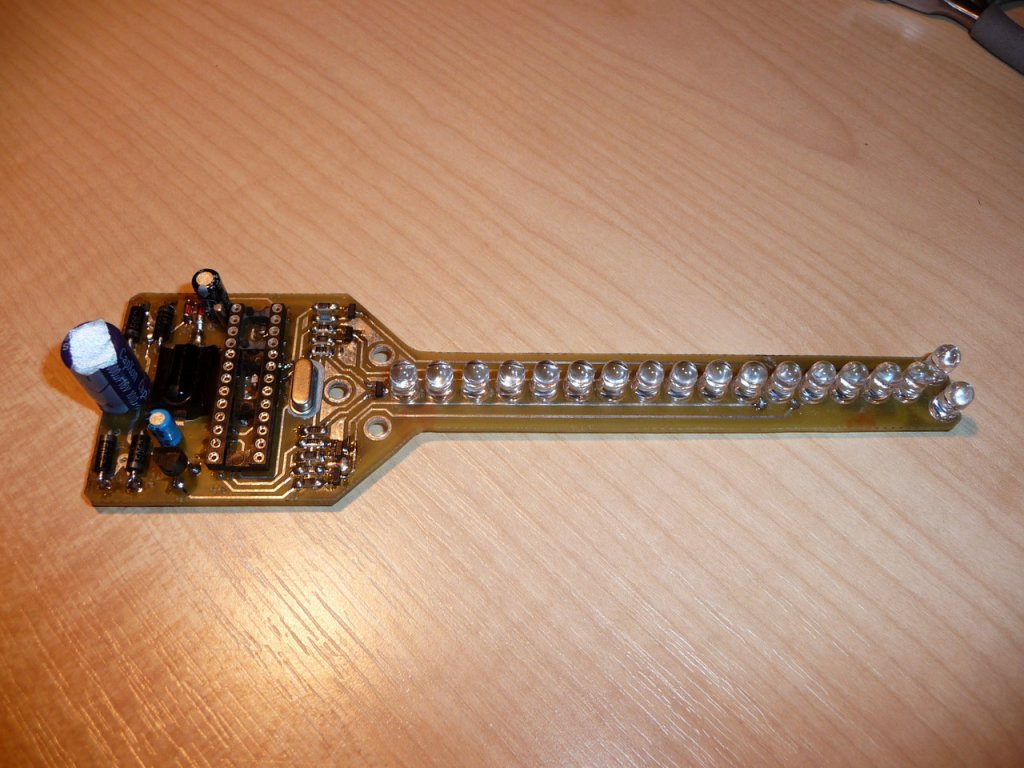 Mellékletem az én változatomat. Először normál alkatrészekkel építettük meg, majd a panel könnyebbé tétele miatt a tranzisztorokat és az ellenállásokat SMD-re cseréltük. Fontos szempont volt, hogy a LED-eket le lehessen nyomni a panel szintjére (csak 1 oldalról kelljen forrasztani) és hogy házilag könnyen kivitelezhető legyen a panel. A kapcsolási rajzon nem változtattam, csak a NYÁK-ot terveztem újra. A program a 2.27-es RTC-s verzió. A file KiCAD-dal nyitható meg (bocs, nekem ez áll kézre). Néhány jótanács a megépítéshez: A fototranzisztort a PIC-el ellentétes oldalra ("lefele") kell beforrasztani. Az infravevőt (TSOP) elfektettem, az tartja az elemet az egyik oldalról. A panelt átfúrtam az elem helyén. Az elem érintkezőjét egy tönkrement reléből mentettem meg. A shotky-diódát a puffer elkó lábaira forrasztottam, az elkót kifelel (a LED-ekkel ellentétes irányba elfektettem)