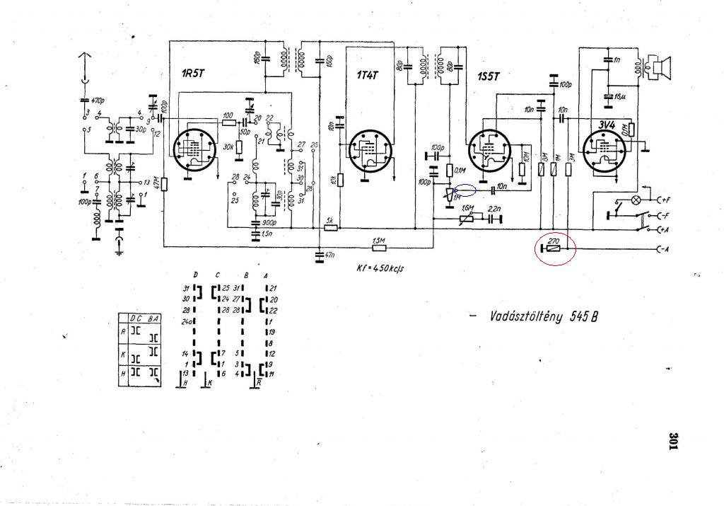 Na kifog rajtam az elektronika. Ez van ha valaki nem szakember. A Vadásztöltény 545B nem akar működni. Sehogyan sem. Az egyik ág kap 51,4V-ot ami picit csökken egyenirányítás után (polaritások rendben nincs felcserélve). A másik ág 2,5V-ot 0,3A illetve itt is van egyenirányítás. Ha már lejjebb csökkentem ezt az ágat például egy ellenállással már kevés lesz, és a csövek el se kezdenek fűteni. Jelenleg minden cső fűt ahogy kell nem izzik a kelleténél jobban. Ha a skálaizzót (amit magam pótoltam 3V körülire) bekapcsolom még marad a fűtésre energia viszont egy hangyányit visszaesik. Nos bár azt mondta akitől kaptam a rádiót, hogy csak telepről ment mégis (a pirossal bekarikázott a kapcsolási rajzon) a 270ohm-os ellenállás szó szerint megfeketedett. Ami gyanúra ad okot ezért a környékbeli ellenállásokat amik nem stimmeltek vagy már a színük is gyanús volt kicseréltem. Persze először csak ezt az egyet cseréltem ki. Tesztelés során iszonyatosan gerjedt zúgott és a bemenetére tett tiszta jelet csak ritkán szaggatva, recsegve adta tovább. Az ellenállások cseréje valamelyest javított a dolgon, már nem szaggat annyira maga a hang. De a gerjedés megmaradt. A kékkel bekarikázott helyen ha hozzáérintek csavarhúzót szépen el kezd búgni mintha baja se lenne. De ez csak akkor ha a hangerő teljesen fel van tekerve. Ha lentebb tekerem a hangerőt akkor a búgást átveszi a potméter. De mellette ott a nagyon hangos zúgás ami a hangerőszabályzással fordítottan jelentkezik mint jelenség. A készülék egyetlen elektrolit kondenzátorát persze egyből cseréltem. Rádióra kapcsolva plusz antennával tekerés közbe olyan mintha ott lennének a rádió adások de mindegyiknél csak szaggat vagy zúg, tulajdonképp olyan érzésem van mintha az alap zúgás ami keresztbe tesz mindennek. A csöveket nem tudom cserélni nincs másik garnitúra. És kezdem beadni a kulcsot, rengeteg időt beleöltem már....jól jönne valamilyen tipp