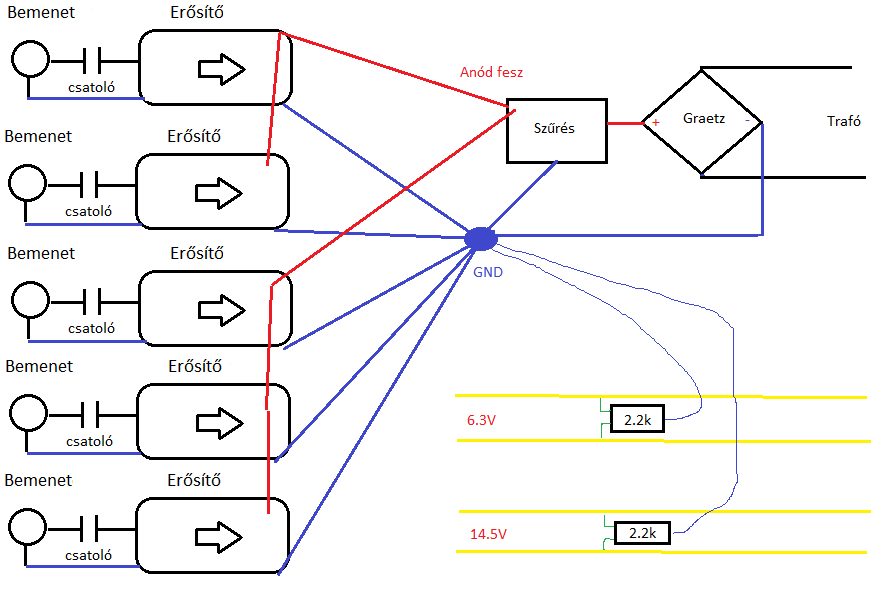 Most kipróbáltam a negatív visszacsatolást, kimenet egyik ágát gnd-re kötöttem, másikat egy 1.2kOhmos ellenállással rávittem a katódra, aminek eredményeképpen a búgás eltűnt és csak minimálisan csökkent a hangerő, ezt max korrigálom majd a trióda anód osztójánál. A katód és a föld között is egy 1.2kOhmos ellenállás van. Nincs most több ilyen ellenállásom, de valószínűleg ez lesz a megoldás a többi csatornánál is, mert a korábban tárgyalt kiközepezés abszolút semmilyen hatással nincs a macira, teljesen mindegy hova van tekerve a potméter a fűtés vezetékein. Valamint visszacsatolás nélkül néha van egy kis gerjedés is.