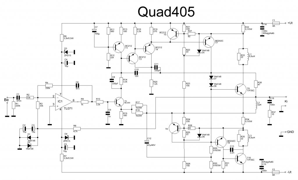 Építesz 2 x 2db Quad405-öt, az általam már említett módosításokkal. Teszel eléje egy KA4558-as vagy NE5532-es dual OPAMP-ot, mellyel egy fázisfordítót készítesz. A két Quad már ellenütemben fog üzemelni. 8Ohm terhelést tehetsz rá. Teljesítménye, végtranzisztorkettőzéssel kb. 300 - 500Watt körül lehet. Elméletileg... Gyakorlatban én sem próbáltam még ki, mert a 300Watt is már bődületesen sok.