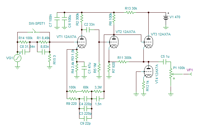 Megcsináltam a képen mellékelt módosított Hiraga korrektort. Néhány meglepetéssel szolgált: a DC-szervó kondija tuti, hogy nem 1 µF (a képen 1 mF-nak van írva, úgyhogy ez inkább 1 millifarad vagy szokványosabban: 1000 mikrofarad), mert különben 1 kHz alatt már nincs RIAA-korrekció, tehát egyelőre beletettem egy 100 µF elkót és mintha vagy az erősítése túl nagy vagy a kivezérlési tartaléka mintha kevés lenne, mert (egyelőre csak inverz RIAA bemenet nélkül) végigtekertem a generátort és vele együtt a szkópot is és azt tapasztaltam, hogy mélyebb frekiken, ahol pl. a HFM1 röhögve még szépen erősít, ez pedig beveri a fejét a tápfeszbe... Meg tudná mondani valaki, hogy egy átlag MM-hangszedő 1 kHz-en mennyi feszt adhat ki maximálisan? - mert akkor ez már támpontot tudna adni a többi frekin is a RIAA-görbe függvényében... Köszi szépen.