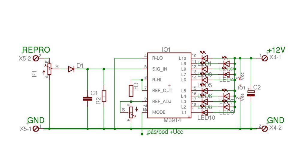 Szia! Működik, mégsem ajánlom. Ezt egy LM3914 egyedül megcsinálja, sőt még két ledet is ráköthetsz. Kivezérlés jelzőnek amúgy sem az igazi a lineáris ellenállás sor. Erre a célra az LM3915-öt választanám. Természetesen minden esetben szükség lesz csúcsegyenirányítóra, hogy ne csak vibrálás legyen az eredmény
