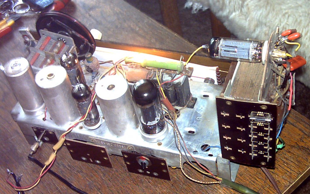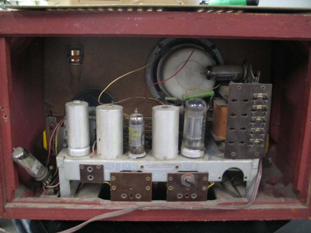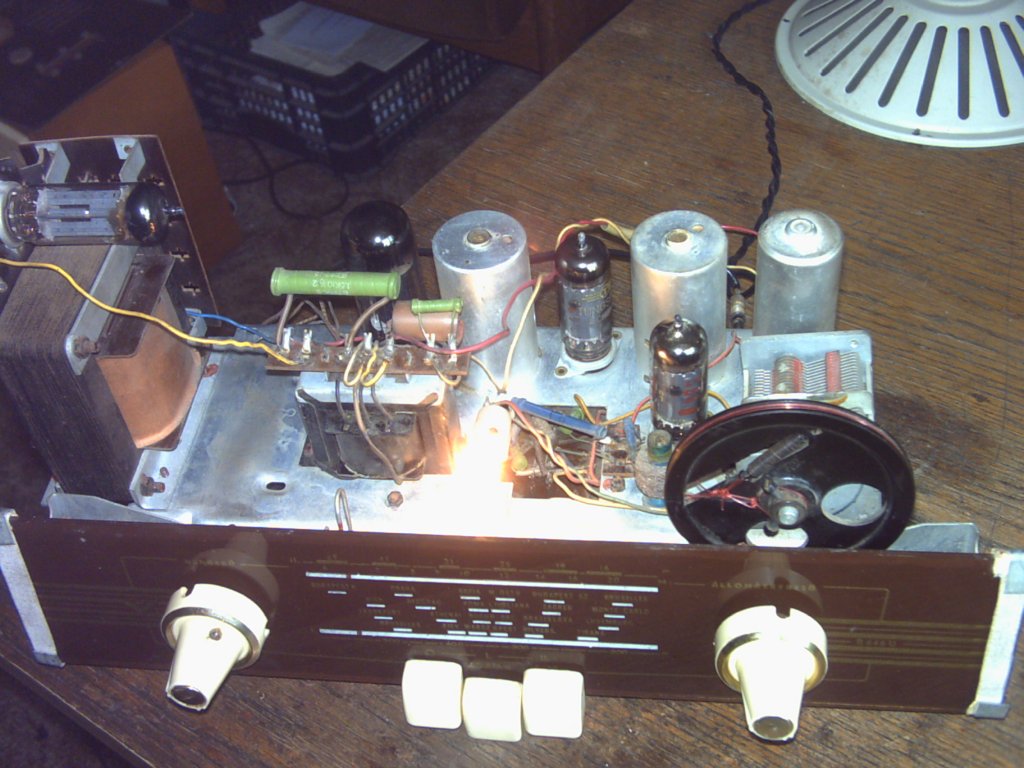 Üdv! Na megérkeztek a készülékek amiről múltkor írtam, a velence egész jó állapotban van. A politúrozás kicsit kopott valamint a skálaüveg el van törve de valaki megjavította így csak közelről látszik. Nem lesz vele sok munka egyenlőre a hálózati csatin szakadást mérek, mint kiderült a kapcsoló nem érintkezik, a biztosíték szétesett olyan koros volt, valamint pár kontakthiba van még de minden más ép benne. A szimfónia már neccesebb a doboz nagyon megviselt, belül tiszta kosz még egérfészek is van benne, a skálahúrozást gyakorlatilag megette az egér és az idő de a mutató megvan és az ebl21 át van szerelve el84-re. Ezen még nem mértem semmit mert úgy gondolom egyenlőre felesleges. mellékelek pár képet vga kamera miatt bocs de ez van.(készül már egy lámpa ami jól megvilágítva valamelyest javít a minőségen majd)