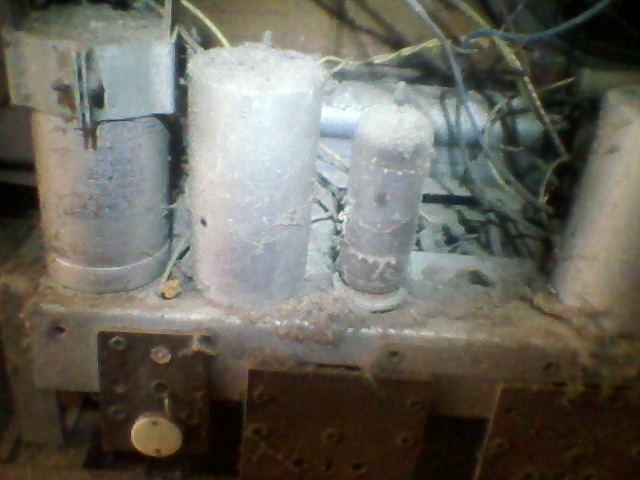 Kb. 1 óra üzem után az anódfeszültség szűrő kondenzátor(50+15 mikrofarád) erős melegedését észleltem. Kikapcsolás után az emeletes elrendezésű elkó felső(15 uF) tagjának erős átvezetését mértem. Ez az elektrolit kondenzátor úgynevezett "nedves" elkó ezért óvatosan az alsó pereménél körbeköszörültem. Ahol először átszakadt az alumínium ház, ott nagy nyomással kiürült a benne lévő folyadék. Mindkét perem leköszörülése után eltávolítottam a belső szerelvényt ami koncentrikusan elhelyezkedő alumínium hengerekből állt. Kiderült, hogy a felső tag folyadékhiányosan üzemelt, túró szerűen összesűrűsödött anyag volt csak benne és a pozitív kivezetés szinte teljesen át volt maródva. Az eredeti alumínium házba két modernebb, nagyobb feszültségű elektrolit kondenzátort szereltem, a negatív kivezetéseket közösítve a csavaros záró elemhez, a menetek tövéhez vezettem, így helyére csavarozva a sasszihoz jó kontaktust adott. A leköszörült zárókorongokat visszaragasztottam, a felső tagon rossz elkóházból levágott peremes tárcsával az eredetihez hasonló kinézetet sikerült elérnem. A felületes szemlélő észre sem veszi a jócélú "csalást". Huzalkivezetéses modern elkók között nagyobb feszültségtűrésű és jóval kisebbek is kaphatóak.