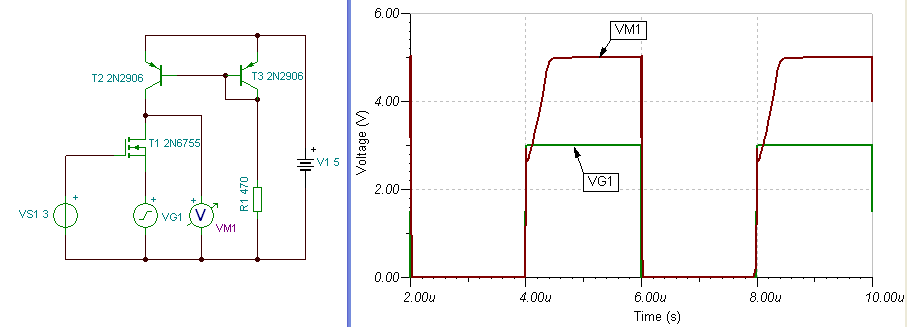 A 10kohm-mal párhuzamos 10pF is 0,1us-al növeli a felfutást. Gyors jelekhez a 10kohm semmi képen nem elégséges. Egyébként a lassú felfutást, akár a Fet parazita diódájának kiürülési ideje is adhatja. A Fet bekapcsolási ideje, sokkal kisebb lehet, mint a kikapcsolási idő. Ha egy látszólagos kondit képzelünk a DS közé, akkor érthető a jelalak. Amikor a generátor felugrik a 3V-ra, azt a kondi követi. Majd fel kell töltődnie 5V-ra, de ezt már csak az ellenálláson keresztül képes megtenni. Próbáld meg lecserélni a Drain ellenállást, egy áramtükörre, mennyire javul majd a helyzet. üdv! proli007
