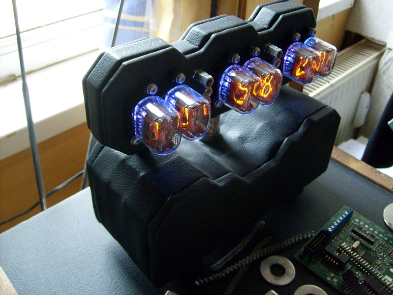 A másik készülék pedig egy Nixie csöves óra lenne. Egyedi dobozolással,színváltós kapcsolható RGB ledes csőalávilágítással,változtatható színű elválasztó pöttyökel. Fából készült doboz bőrrel borítva,elektronikailag pedig Tom025 6 csöves órája van összeházasítva vicsys féle óra tápegységével.