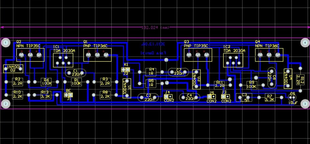 Üdv! A BBS elektronikán láttam a TDA2030-as kapcsolást, amelyet majd én is megfogok építeni. A pufferkondik utáni kisebb kondikat tényleg így ép szerűbb elrendezni? Mellékeltem a nyomtatott áramköröm rajzát, tudnátok vetni rá egy pillantást, hogy jó lehet így az elrendezés. Köszi!!
