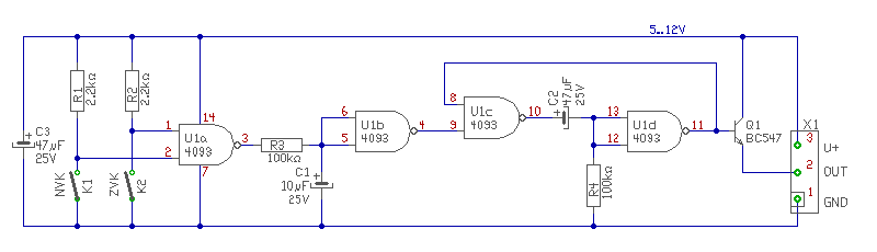 - U1c és U1d egy nem-újraindítható monostabil multi. Ez fogja megszakítani a vevő tápfeszültségét. Időzítése a C2/R4 tagokon műlik, jelenleg kb.0,5sec.