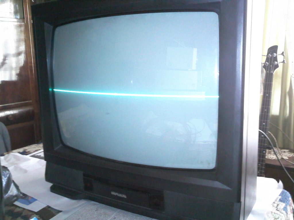 Kaptam egy eldobásnak szánt tv -t ,de sajnáltam szétszerelni gondoltam egyet probálkozom vele hátha elindul. Bekapcsolom majd egy vizszintes zöld csik jelenik meg majd kék lessz. A képen látható a jelenség. hang van . A tv imperial mod.prisma 20m93a Nem látok benne pupos sem szétrepedt kondit , hol keressem a hibát _mi lehet rossz?