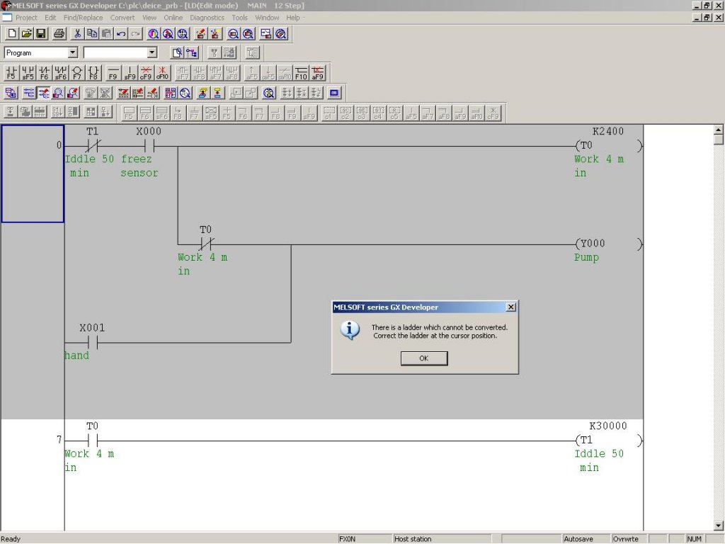 Urak, vetne valaki egy pillantást a csatolt képernyőmentésre? Mitsubishi FX0 PLC. Egész addig jó a forditás, mig be nem kötöm az alsó "hand" jelzésű X001 bemenetet. Forditáskor ezt a hibaüzenetet adja, és a kurzortéglalapot felviszi a bal felső sarokba. Thnx