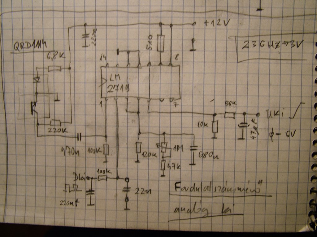 Itt a két kapcsolási rajz,a füzetemből csak fotózni tudtam,de azért olvasható.Az első a szélmérő,a második a fordulatszám mérő.A konverziós tartományt a 2 láb kondija és a 3,4 láb ellenállása határozza meg 6V-ig lineáris a kimenet.Ha impulzus kimenet nem kell, a 4516 elhagyható.Mivel a forgórész bizonyára kefés,szerintem a kommutátorokat fesd le felváltva fehér-feketével,csodás jelet fog adni és nagyobb frekin, mint a vas hornyok,a kimeneten könnyebb kiszűrni a konverziós zajt az aluláteresztő szűrővel.Különben ma legalább 15 órás analóg rögzítést csináltam,nagyon tanulságos,majd később néhány részletét felteszem.