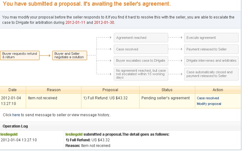 Több, mint 30 napja rendeltem egy terméket DHGate-ről. Valahol eltünt a postázás közepette, mivel 30 napja postázták és a ragszám alapján csak elindult, de semmi. Míb az ugyanekkor megrendelt többi termék már rég megjött. Szóval nyomtam egy Refund and Returnt DHGaten. Paypalon semmit nem léptem, csak az oldalon. Kérdésem, hogy így jól jártam e el, vagy javasoltok még valamit. A mellékelt kép alapján z oldalon most várni kell, vagy kell még valamelyik gombra/linkre nyomni?