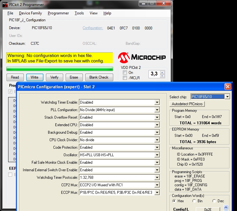Problémába ütközöm egy 18F65J10 felprogramozása során... Pickit2-vel kezelem a PIC-et és megy is az olvasás és a törlés is, de amikor a Flowcode-ból fordított hex-et szeretném betölteni akkor ezt a hibaüzenetet kapom... Hol ronthattam el?