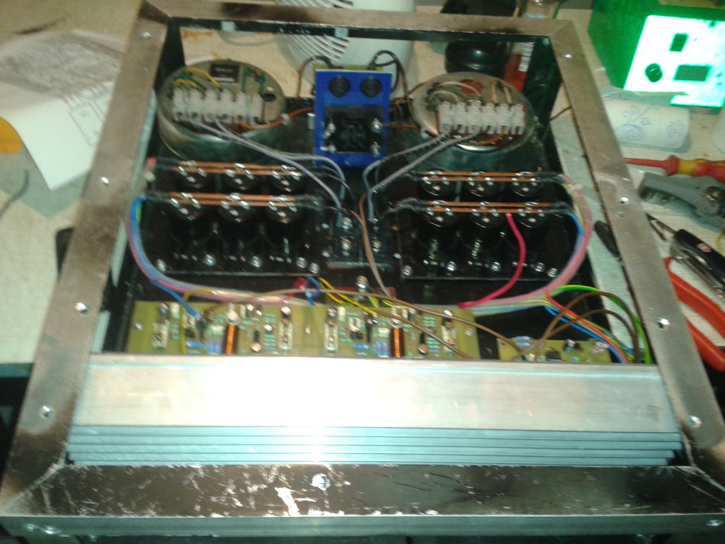 Mint látható, hűtőborda jelenleg csak az egyik oldalon van. Az erősítő folyamatosan megy, de csak itthoni használatra, és nem teljes teljesítménnyel, Így még a hűtéssel gondom nem volt. Persze 'csumára" kihajtva így nem bírná. Az áthuzalozással kapcsolatban köszönöm a tanácsot. Igyekszem megfogadni. Üdv... Subi