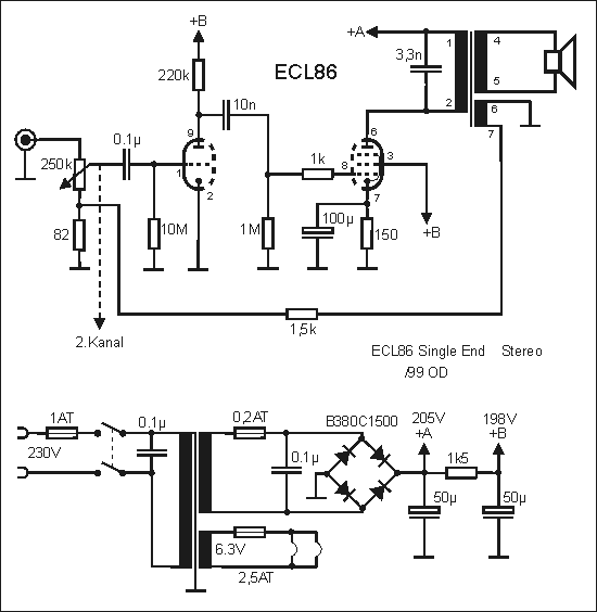 Egyébként nem értem, miért kéne aZ ECL86-nak 205V-ról járnia. Adhatsz neki akár 280V-ot is, csak a segédrácsot tedd alacsonyabbra. A katódellenállás lehet 180 Ohm is.