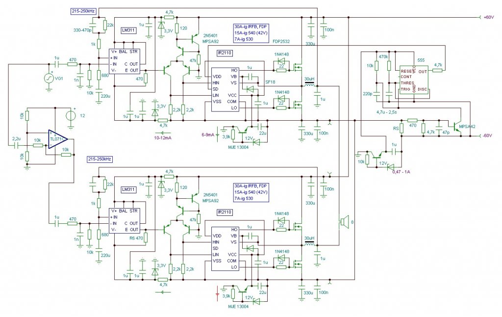 Erőt vettem magamon és összepókhálóztam az UcD-hez az 555-ös védelmet. Eddig csak kisebb áramon próbáltam, de úgy néz ki hogy jó lesz. Az előnye hogy nem kell széttúrni a meglévő nyákot hanem kívülről is hozzáépíthető egy pici nyákra, csak az IC SD lábát kell lekötni a negatívról és kivezetni. A rajzon lévő értékekkel kb. 2,5s-ig áll a végfok (ami akár egy LED-el is megjeleníthető az előlapon). A hidalt verziót is kipróbálom majd, oda elvileg elég lesz összesen 1db sönt. Szimpla tápos fázisfordítón gondolkodtam mert az egyszerűbb lenne, csak egyelőre nincs lelki erőm összedobni.