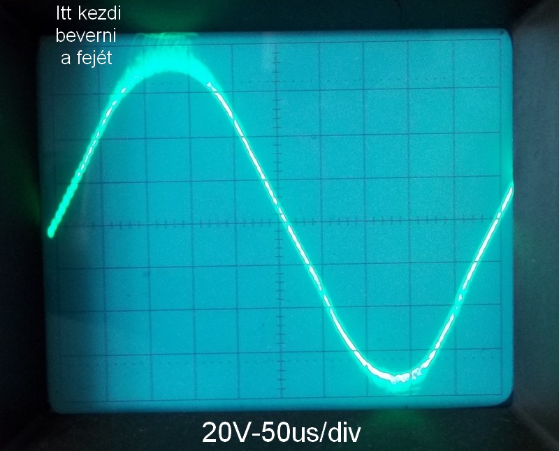 Közben meghidalódott. A 8 ohmos műterhelésre 54V effektív jött le, ami kb. 360W. A hiperszil trafós táp ekkor +/- 44V-ra esett, ami ha jól számoltam akkor 86%-os kivezérelhetőség. A fázisfordító ellenállásai picit eltérnek, ezért a fordított jel néhány %-al nagyobb, ami miatt torzít valamennyit. Nem tudom miért de a fázisfordítóra érzékeny is, ha +/- 12V-ról tápláltam az IC-t (TL071) akkor olyat torzítottak a végfokok, hogy majdnem háromszög volt a kimeneten a szinusz helyett. Most +/- 9V-ról megy, így jó. A rövidzár védelem is szuper, de lehet hogy megnyújtom az időt hogy ne kapcsoljon vissza csak mondjuk fél percenként. Attól még tartok hogy a kapcsitáp majd nem fog neki tetszeni. |