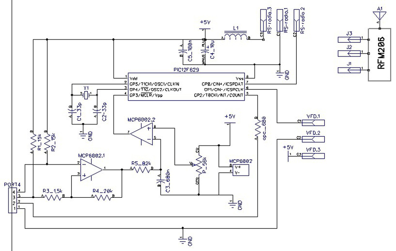 Sziasztok! Készítettem én is DCF órát "CONRAD"-os vevővel és VFD kijelzővel. Sokat kínlódtam a zavarokkal. A VFD árnyékolása látszólag megoldotta a problémáimat, de a szinkronizálás általában 5-30 percig is tartott. (sorozatos bithibák voltak!) A vevő és a PIC közé betettem egy jelformálót - mellékelt rajz - azóta általában 2 percen belül szinkronizál. Szerintem érdemes elkészíteni. A potival nekem kb 2,2V-ot kellett beállítani. Port4-re csatlakozik a DCF vevő.