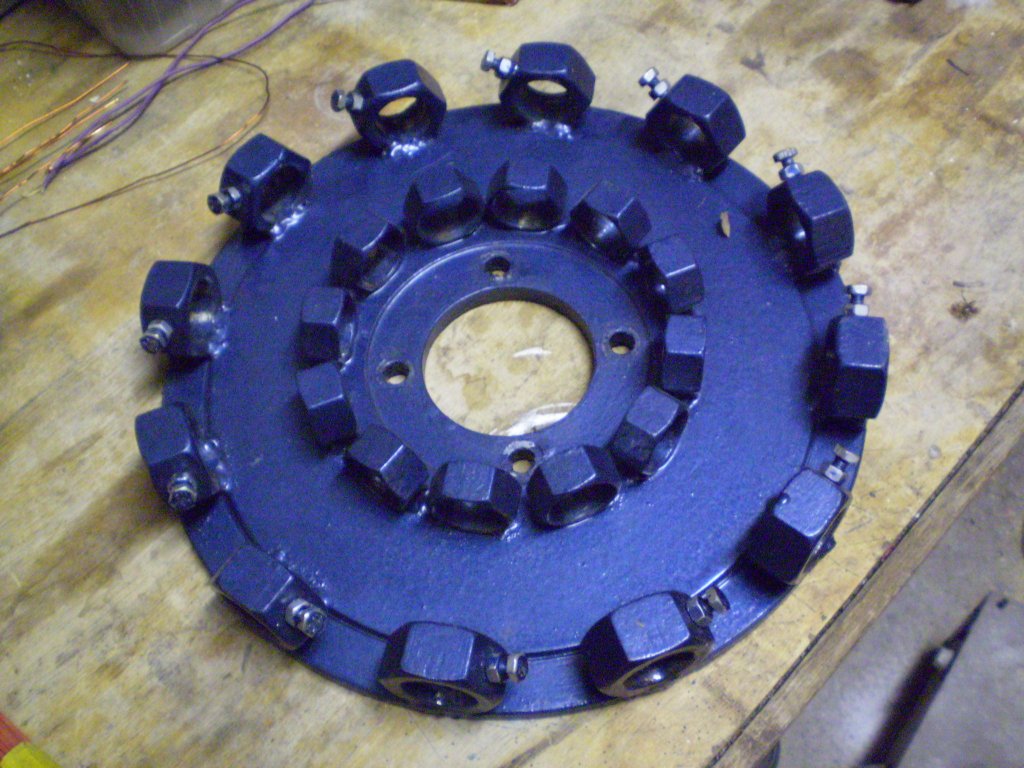 Most szereztem két kidobásra szánt 3fázisú motort. Ezeket szeretném átalakítani neodímiumosra. Néztem a 355. oldalon generátor24 átalakítását, nagyon tetszik, én is ilyet szeretnék készíteni. Az egyik motor ~1240et fordul, 24 hornyú állórésszel(bár ez összesült, de haver megtekeri), a másik 910et, 36 horonnyal, ez hibátlan. 0,55kW mind. Amit abszolút nem értek, a póluspárok kialakítása. Melyik motorhoz milyen forgórészt készítsek? Gondolom a 36hornyoshoz 6 pólusút, mint generátor24. A 6 pólusnál nem elég csak a minden 2.ra mágnest tenni? Nagyon lecsökkenne a teljesítmény? Erősebb mágnessel? Most amit néztem bele, 50*20*8 N35. Ez az első elképzelés... Képeken: az oszlop tetejére való csúcs, majd rajta a gyűrű, és a csapágy, a pányvázó hevedere, és az akkupakkom(a két feketéből van még 1-1)