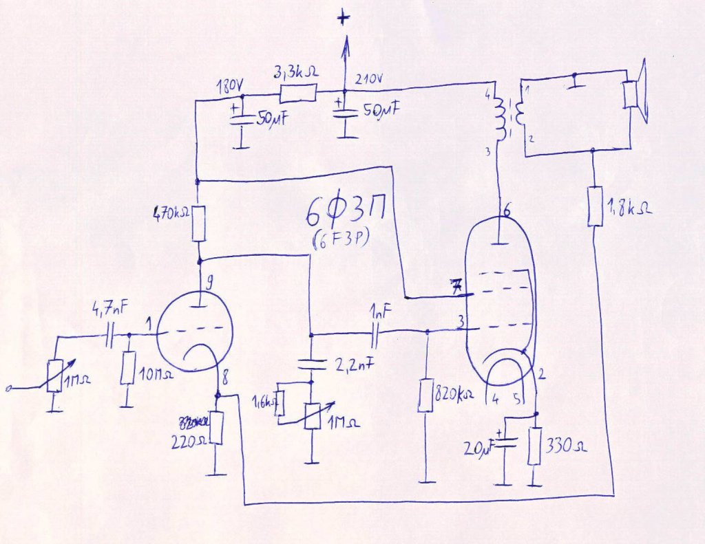 Régóta foglalkoztatnak a csöves kapcsolások, most rá vettem magam, hogy alkossak is. Kezdetnek előkotortam egy valamikori lemezjátszóból kimentett erősítőt, amit szeretnék kicsit "okosítani", és szépen bedobozolni. Lerajzoltam a kapcsolását (mellékelve), egy orosz 6F3P cső van benne. Kipróbáltam jelgenerátorral, azt vettem észre, hogy alacsony bemenő jel esetén a kimeneten kb 120kHz-es jellel keveredve jelenik meg a bemenő jel. Gerjedne? Mitől? Nagyobb szintű bemenet esetén szép az átvitel, a hangja is alakul, kissé brummos. Mit érdemes rajta átalakítani? Én a graetz-et cserélném pl. 1N4007-esekre, nagyobb puffert használnék és lehet hogy a pentóda katódköri elkó is kiszáradt már (esetleg oda mehetne nagyobb?). Egy EM80 vagy EM84-et lehet hogy én is akasztok majd rá...